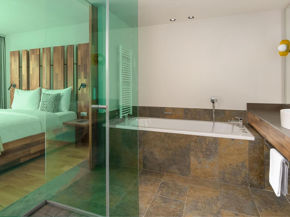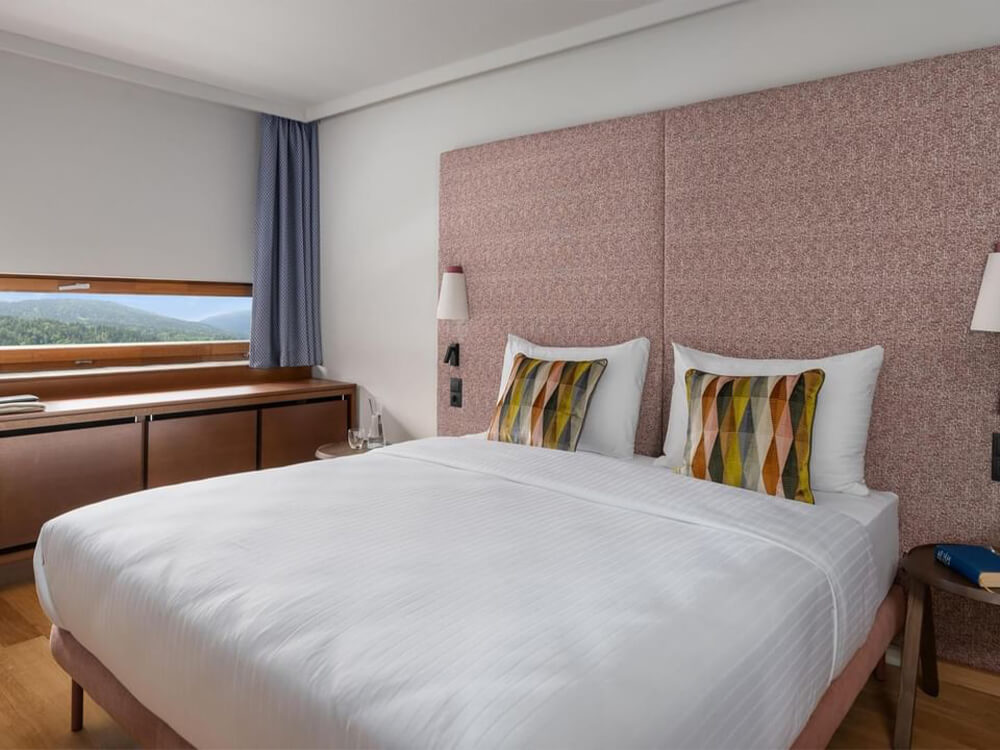 1/2-4 Junior suite village view/mountain view: cca 47 m2 smještaj za 2 odraslih i 2 djece do 12 godina ili 2 odraslih i 1 osoba starija od 12 godina; village view-pogled prema mjestu, mountain view- pogled planine